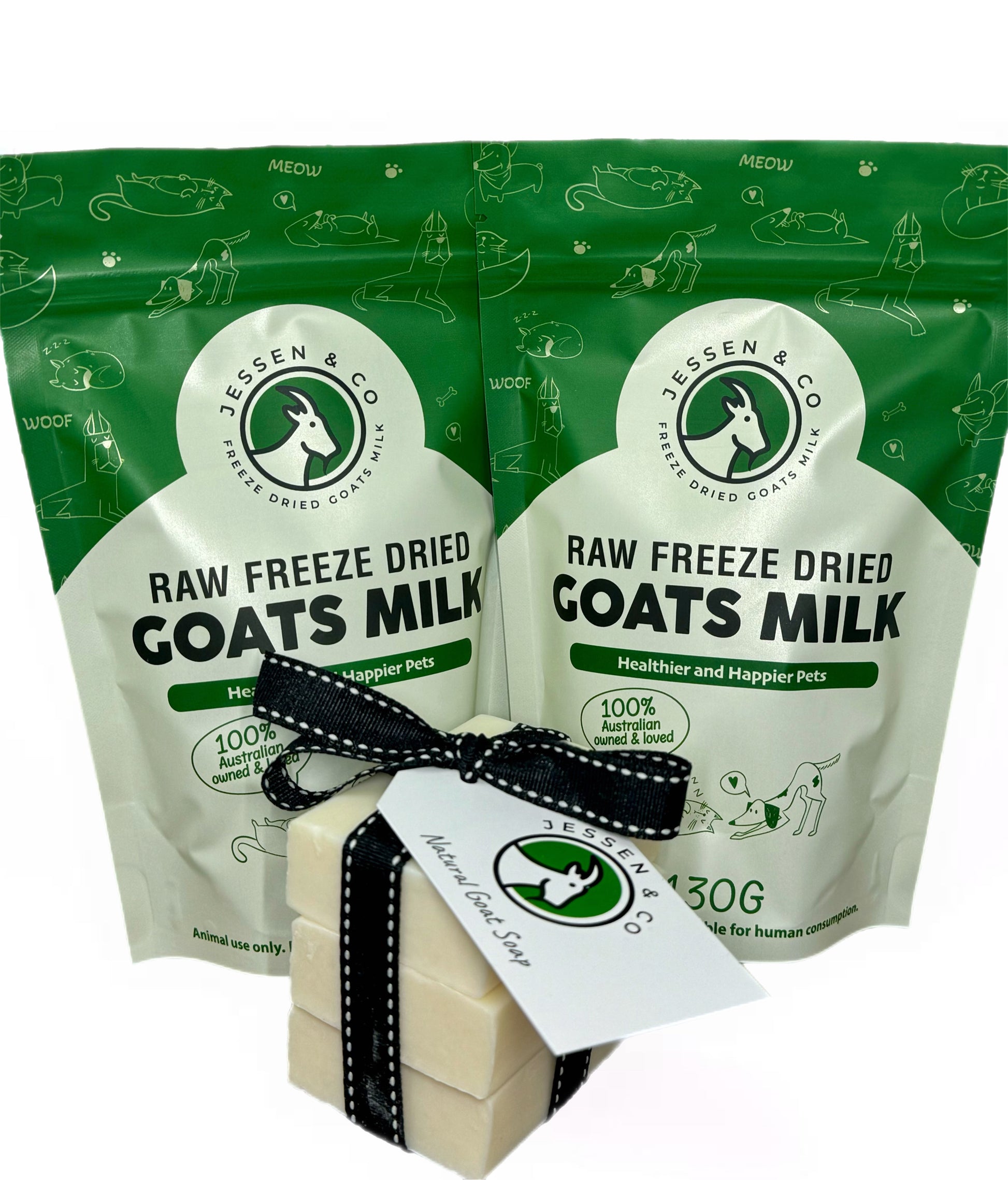 Jessen & Co RAW Freeze Dried Goats Milk offers a 100% natural, naturally A2 milk source ideal for supporting happy, healthy pets. This freeze-dried formula preserves essential nutrients while ensuring easy digestion and optimal nutrient absorption. Perfect for pet owners seeking a wholesome, natural supplement to enhance their pets' wellbeing.